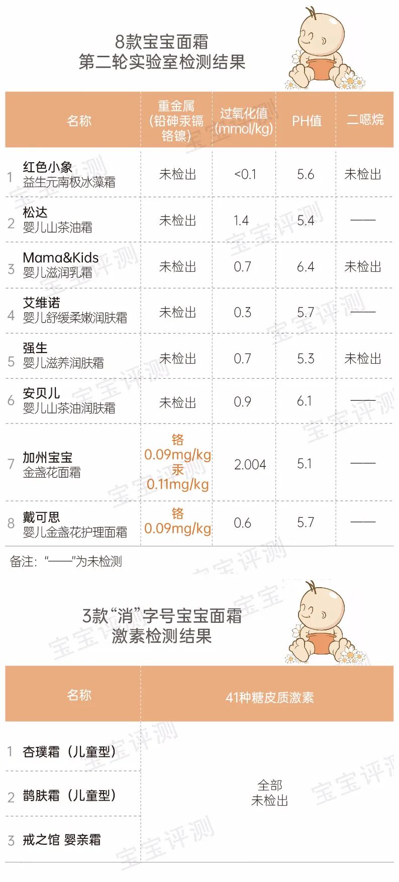1、加州宝宝、戴可思,均检出了微量的重金属铬,含量为0.09mg/kg。铬属于国家标准《化妆品安全技术规范》(2015)中规定的禁用组分。