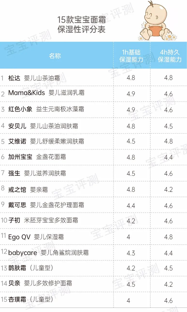 综合各项数据,15款宝宝面霜的保湿性能测评得分情况如下: