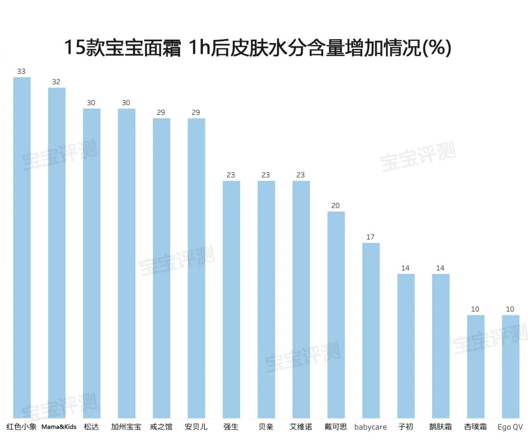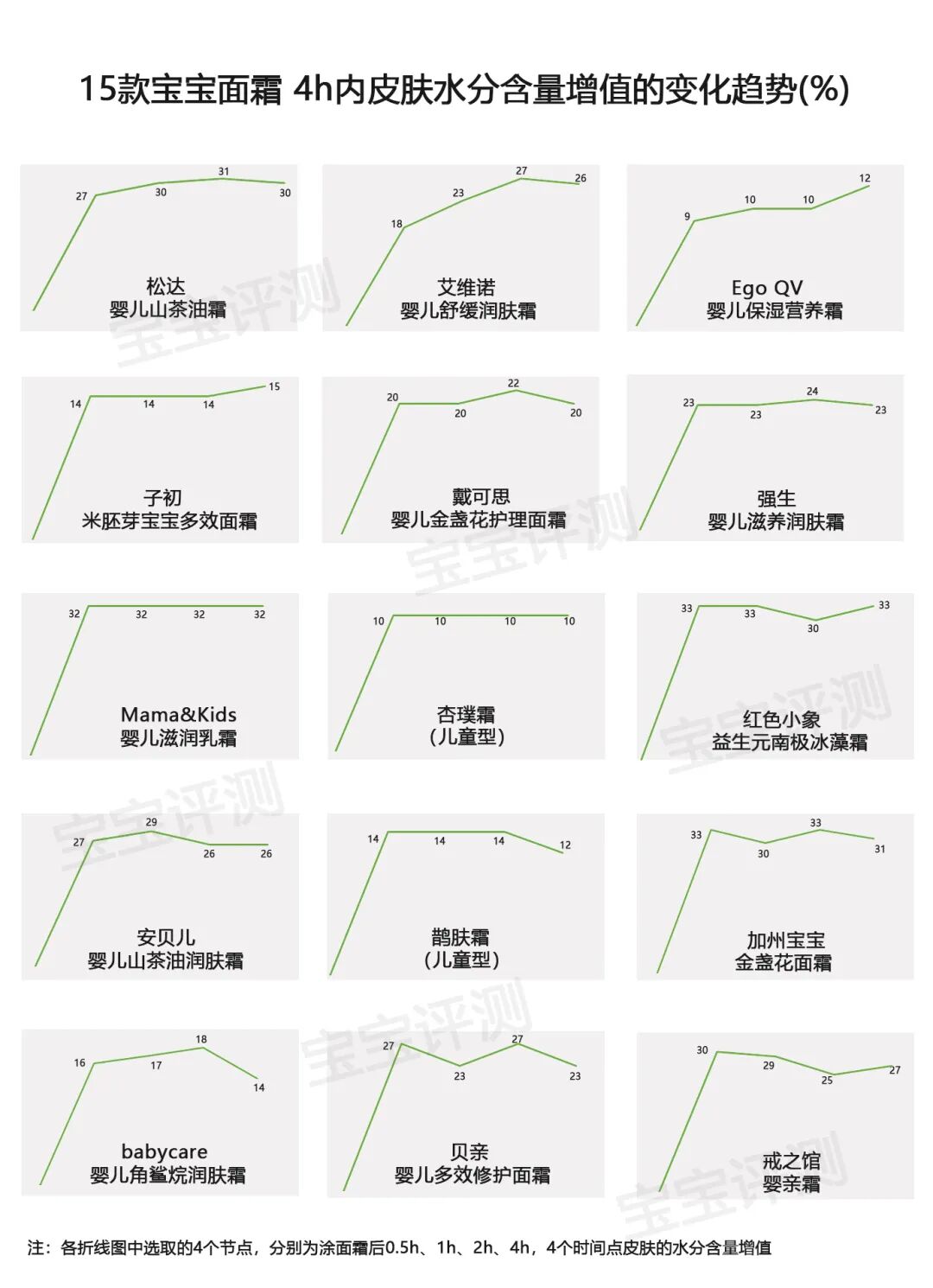 但是,在不同时间节点上,皮肤水分含量的增值有高有低,可见,15款宝宝面霜的持久保湿能力有一定差别。