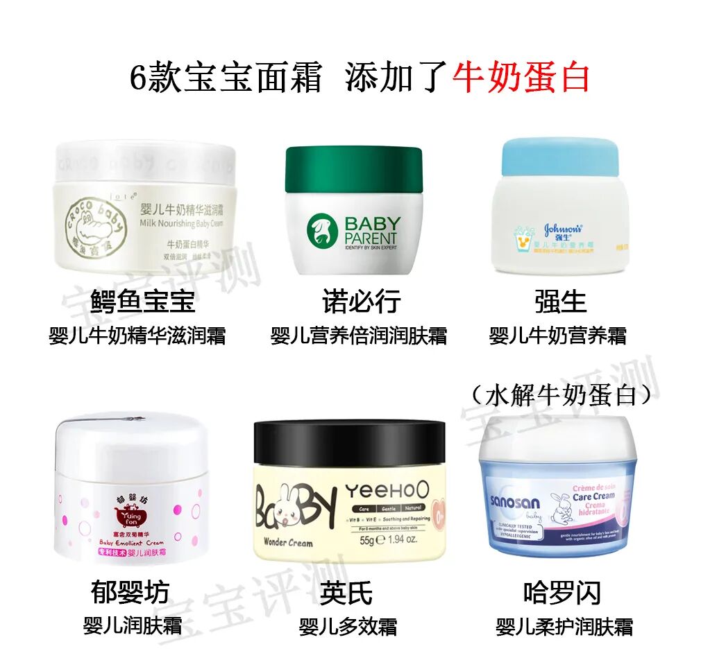 本期评测的51款宝宝面霜中,鳄鱼宝宝、诺必行、强生、郁婴坊、英氏、哈罗闪6款面霜含有牛奶蛋白成分。