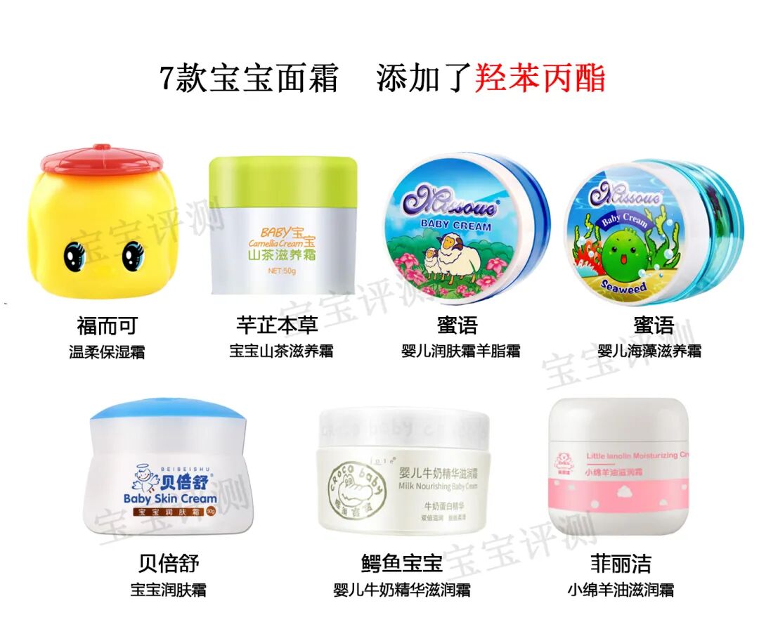 本期评测的51款宝宝面霜中,有9款添加了羟苯甲酯,没有添加羟苯乙酯和羟苯丁酯的产品。要注意的是,福而可、芊芷本草、蜜语、贝倍舒、鳄鱼宝宝、菲丽洁等7个系列添加了羟苯丙酯。