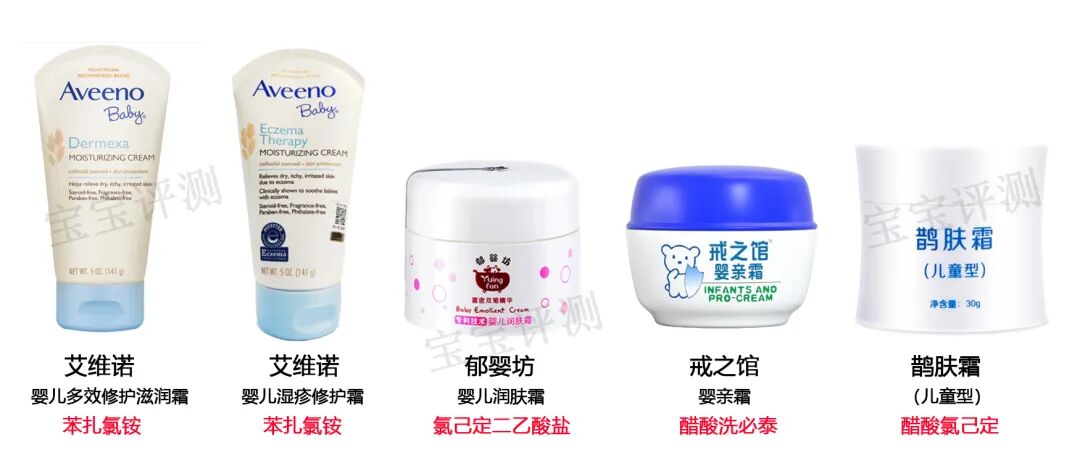 本期评测的51款宝宝面霜中,艾维诺有2个系列添加了苯扎氯铵。郁婴坊、戒之馆、鹊肤霜3款添加了氯己定二乙酸盐、醋酸氯己定(洗必泰),属于氯己定类防腐剂。