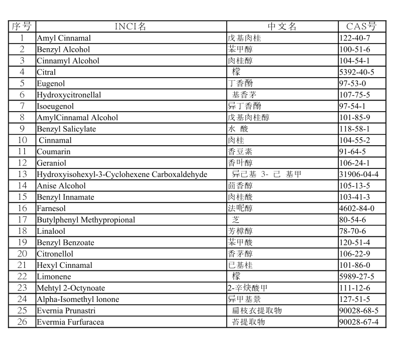 香精虽然能够提供好闻的气味,但上千种香精中不乏致敏性成分,欧盟的化妆品指令列出了26种容易致敏的香精名单: