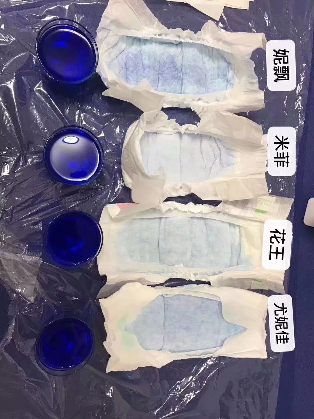 花王表面有吸不进去的水珠了,妮飘已经顶不住了,显色严重,表面水闪闪,尤妮佳吸水速度还是最快的,米菲依旧平稳吸收分布均匀,不急不慢。