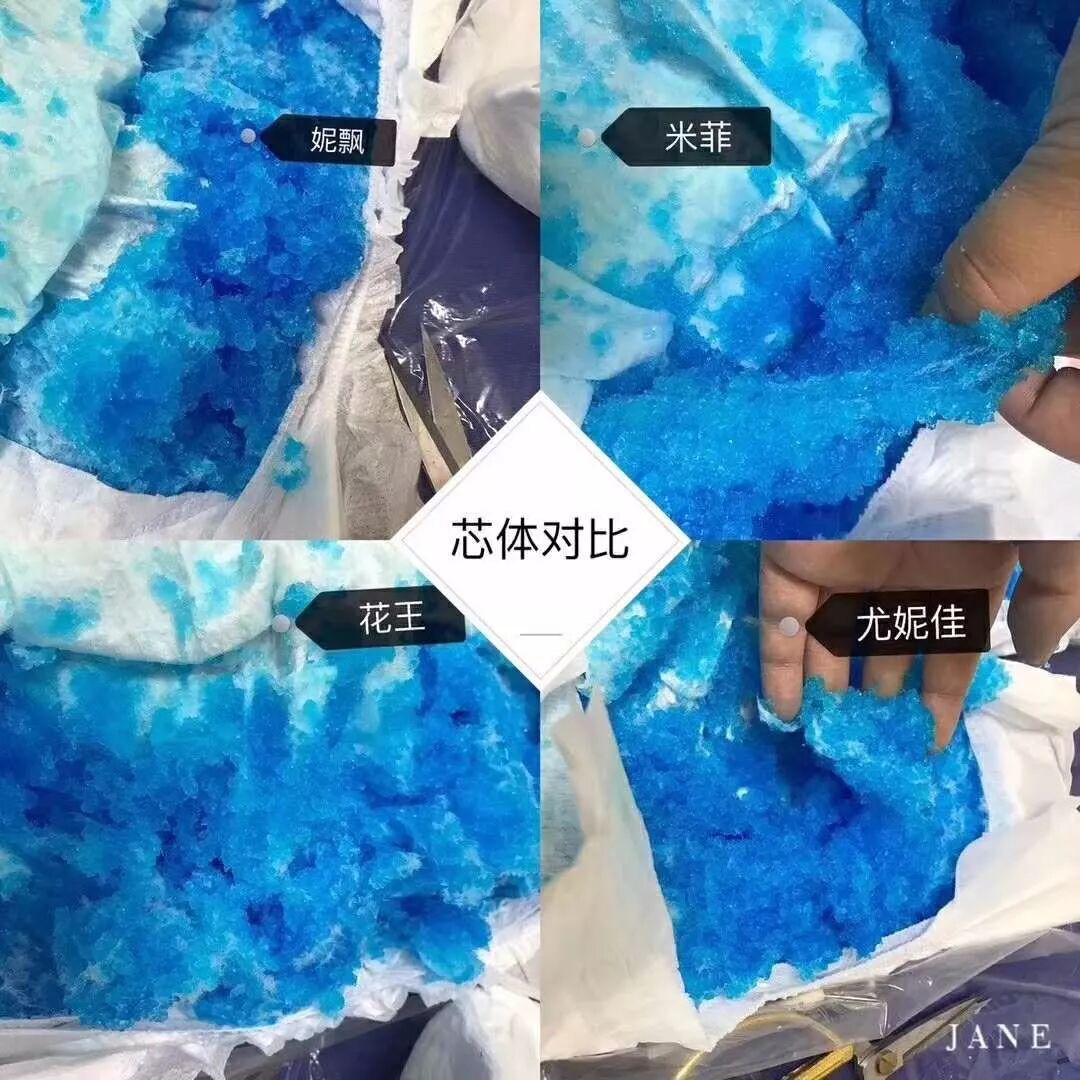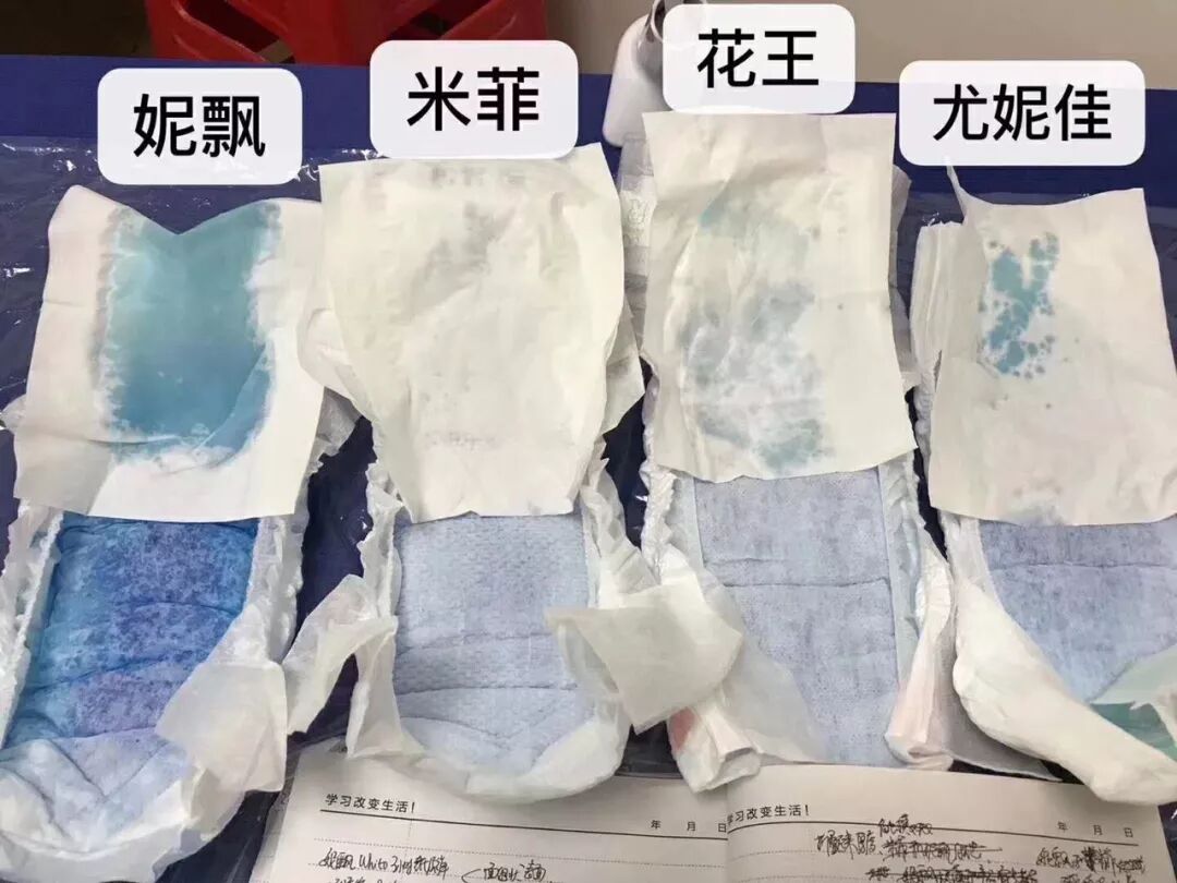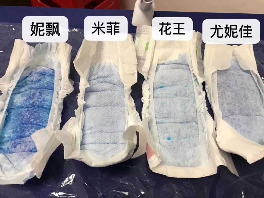 吸水渗透性都不错,妮飘最慢,而且表面显色明显,尤妮佳最快米菲蜂窝孔平稳的分散吸收,花王也差不多。
