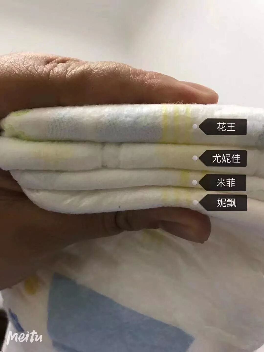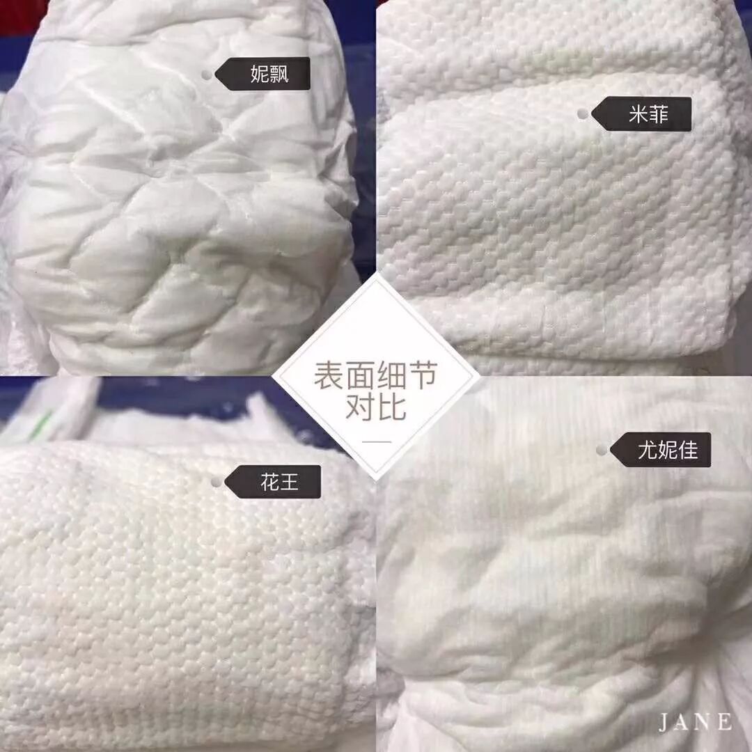 表面层米菲和花王形状差不多,用手触摸的感觉,妮飘和米菲是摸得出的薄,花王和尤妮佳是摸得出的厚实,但是妮飘和尤妮佳的表面手感略差于花王米菲,花王虽厚但还挺柔软,米菲薄柔软度不错。