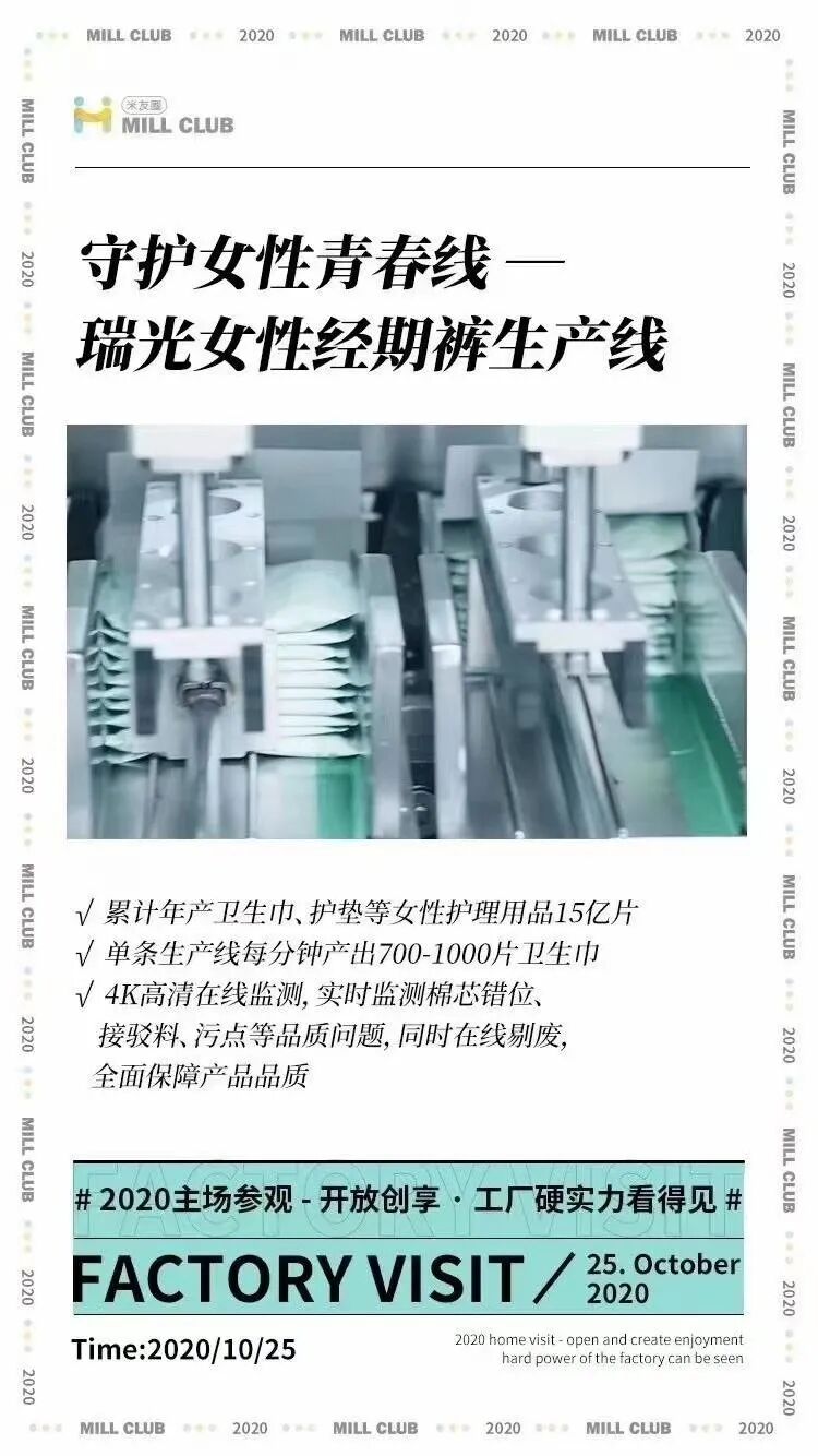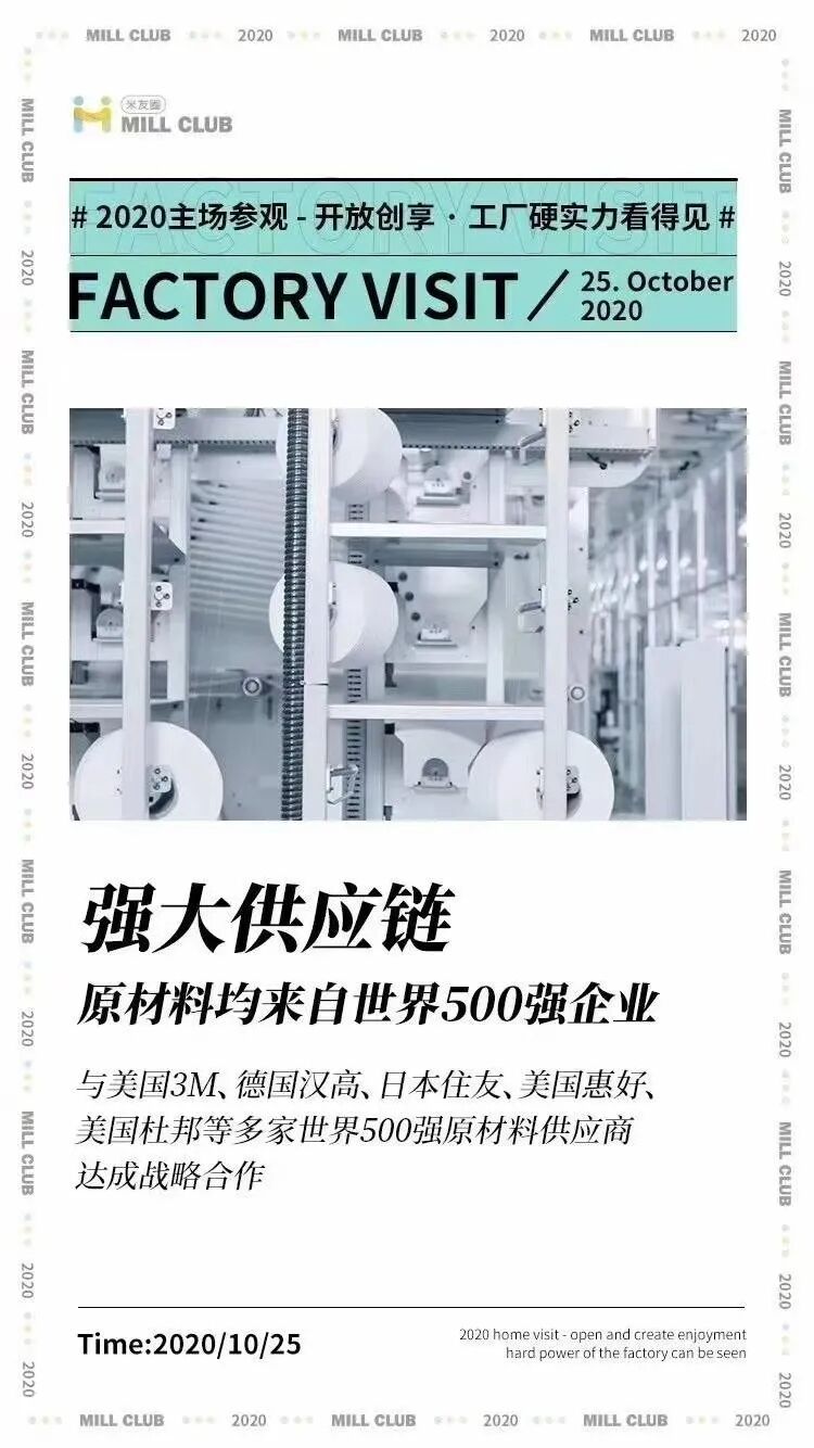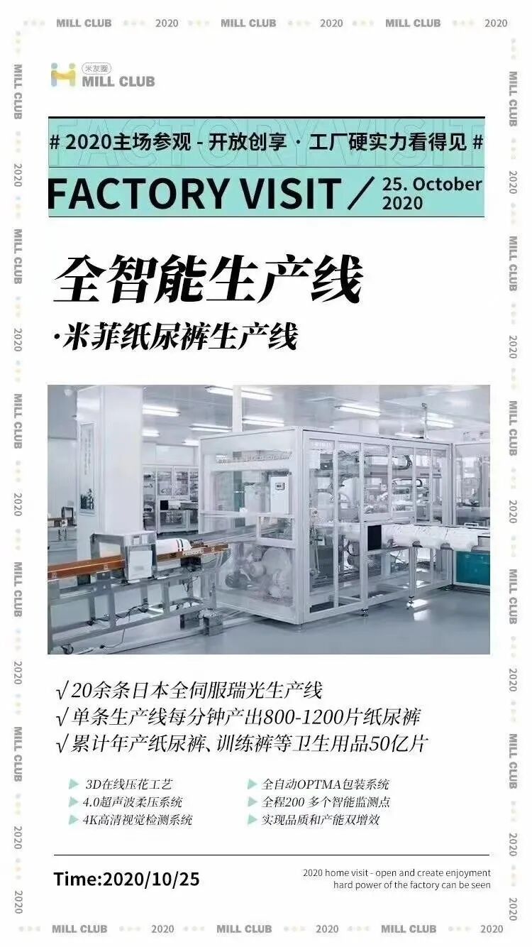 疫情以前,每月都有一次工厂参观日,让你亲眼目睹米菲纸尿裤、姨妈巾等产品的生产过程,因为够专业,因为有底气,因为有实力。米菲做为中国第一个开放工厂参观的纸尿裤品牌,有实力就是这么硬气。