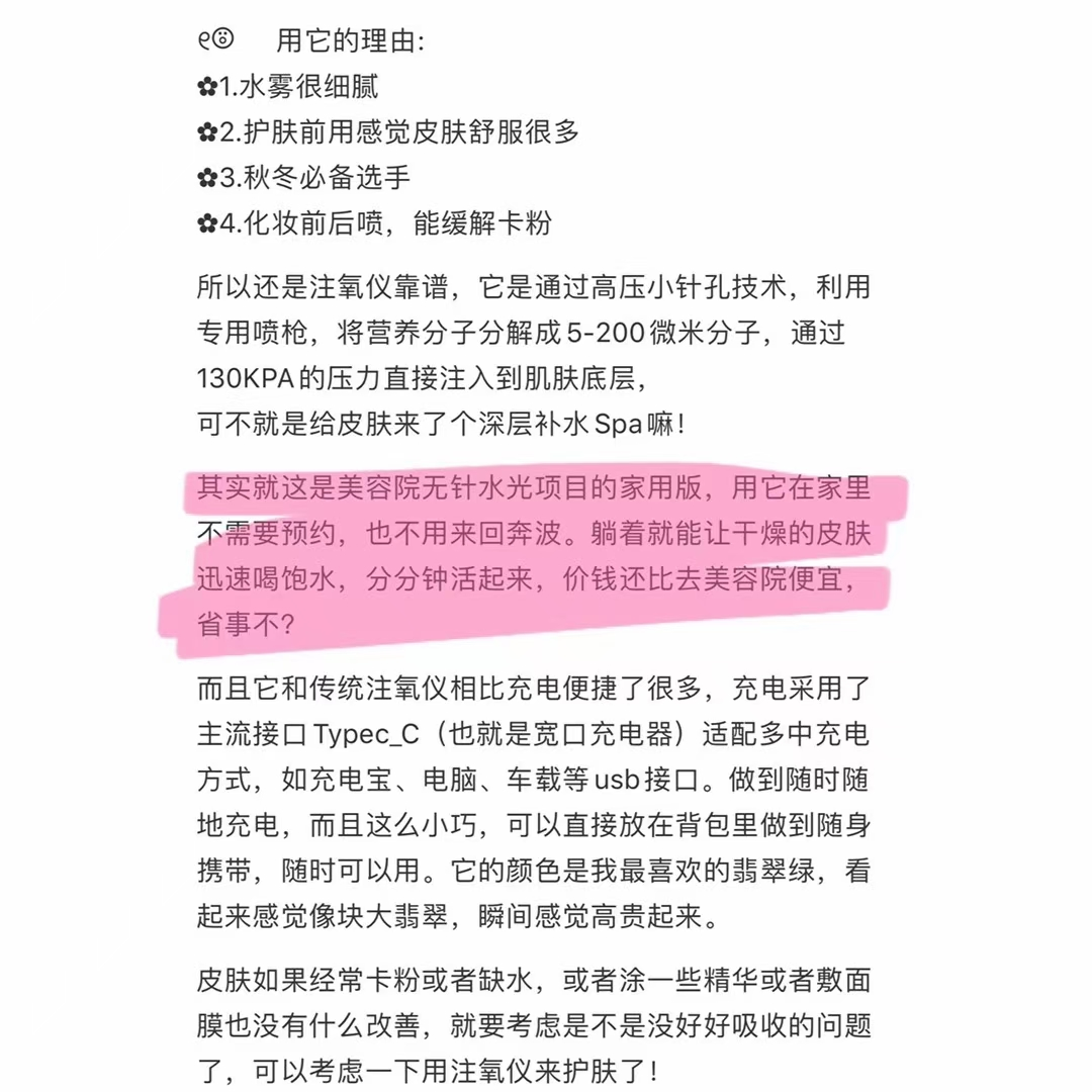 保湿喷雾上脸的水分大部分被蒸发浪费,注氧仪确实可以补水进皮肤基底层,补水效果比面膜快,急救明显。