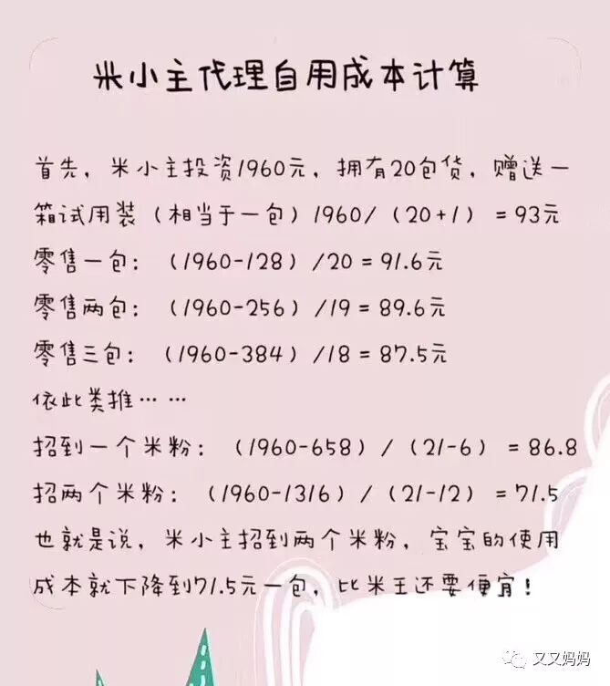 2、边用边卖妈妈:零售利润30元/包。此外,米小主可以招募米小主和米粉两个级别的会员,招一个米小主会员公司奖励150元,招一个米粉会员公司奖励10元,同时米粉还消耗米小主的库存。
