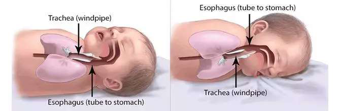 仰卧时候气管在食道上方,俯卧时,气管在食道下方,侧卧时,气管和食道处于同一个平面。我们可以合理推测,一旦奶从食道里返出,仰卧时气管在高处,发生吸入导致窒息的风险要比俯卧和侧卧小。