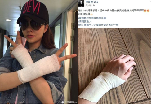 虽然照片里她们都是一副“痛并快乐着”的样子,但这两张打着绷带的手腕照,还是让每个带娃的妈妈忍不住想说一声:好累啊……