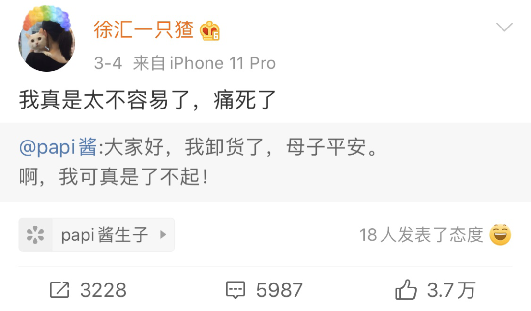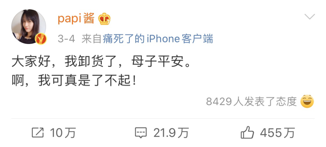 Papi 酱坐月子,2 条微博 6 个字,道尽当妈的感受