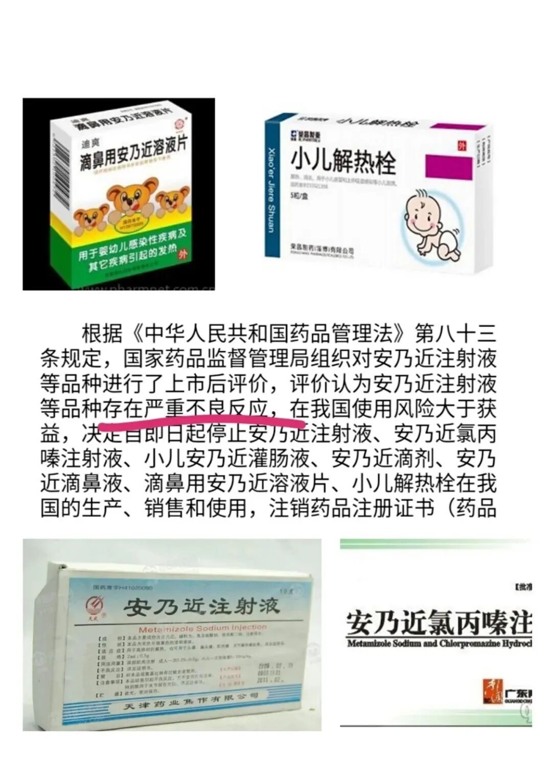 值得奔走相告的是,同时发布的另一份针对安乃近注射剂、安乃近氯丙嗪注射液、安乃近灌肠液、安乃近滴鼻液、安乃近滴剂、滴鼻用安乃近溶液片、小儿解热栓的公告做得非常彻底,直接宣布注销这些药的注册证书,停止这些药在国内的生产、销售和使用!