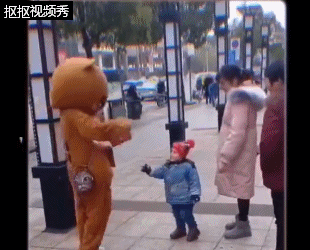 一个三岁的小女孩遇到街边的人偶正在发传单,没有像其他孩子一样冲上去拉扯人偶的外套。