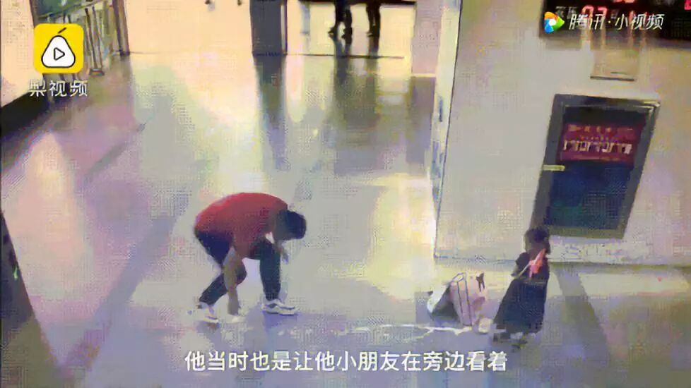 于是,男孩仔细把地面擦拭干净,把东西扔到垃圾桶后,才离开。