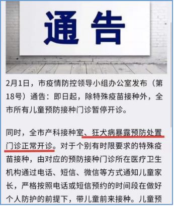 从各个县市的通知当中我们也能看到,虽然疫苗接种门诊关停,但狂犬病暴露预防处置门诊还是正常开放的。