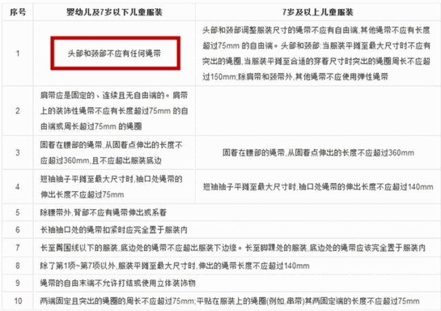 我国《婴幼儿及儿童纺织产品安全技术规范》明确提及,婴幼儿及7岁以下的儿童服装,头部和颈部不应有任何绳带。