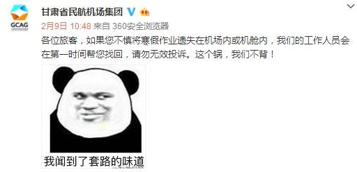 针对长假最后一天小学生集体在飞机上补作业的情况,甘肃民航这样发声:如果您不慎将寒假作业遗失在机场或机舱,我们的工作人员会第一时间帮您找回。