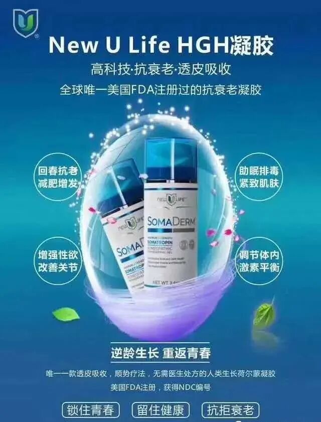SOMADERM能够直接外源补充生长荷尔蒙,Newulife全新“高科技 · 涂抹式 · 更天然”的优势,可以涂抹于手腕、手臂、腋窝、膝盖后面等身体多个部位,渗透吸收滋养,再次感受逆龄的青春。产品已获得FDA国际注册和美国NDC编码,在美国5000多名医生、数十万人使用者効果明显!无一例投诉和产生副作用,非常安全!