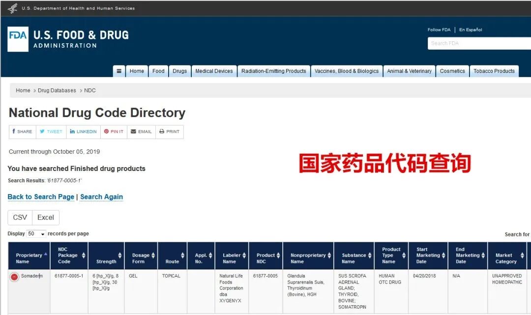 SOMADERM获得美国药监局的药监代码NDC号码(61877-0005-1;61877-0007-1),这是需要7年的临床实验,无数人体和动物参与实验并且无一例副作用的才可以拿到此药监代码。