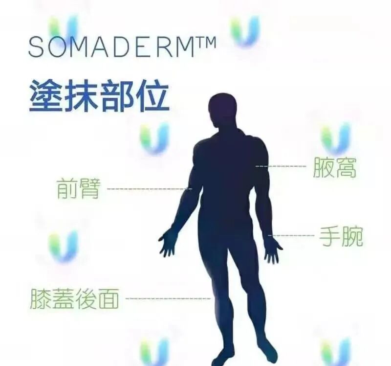 SOMADERM™ 抗老凝胶使用非常方便,局部涂抹在身体皮肤较薄的区域 (如手腕、前臂、腋下、膝盖后侧),使用手腕回转按摩或上下摩擦约 1分钟至凝胶吸收,约5-10分钟即会被吸收到血液中开始作用,来缓解及改善因衰老导致的各种问题。