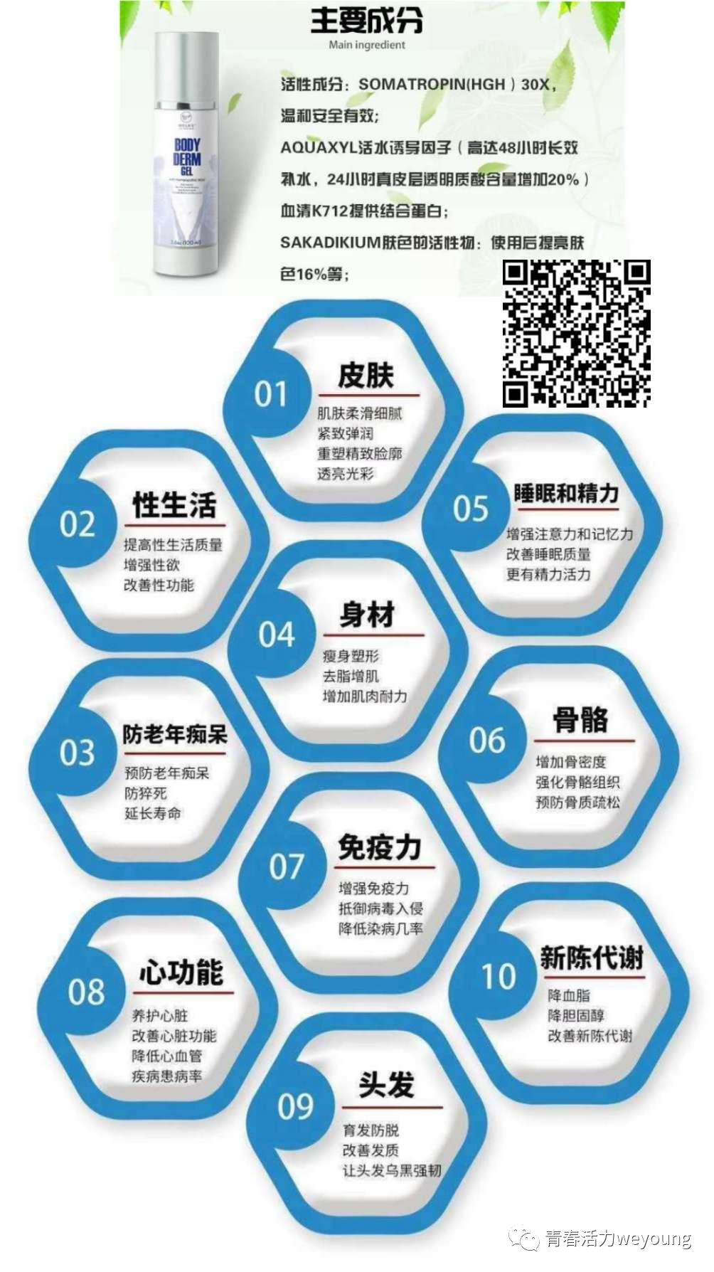 HGH是什么?它是一种物质,是由191种氨基酸组成的活性单链多肽,又叫人体生长荷尔蒙激素,每个人来到这个世界上从0岁开始能够正常成长发育都是因为脑垂体分泌的生长激素才能均衡的发育,五脏六腑才能均衡的生长,生命才能正常的运行,每个人20左右生长荷尔蒙激素分泌达到一生中的顶峰,25岁左右每年呈1.5%的速度开下降,所有人的亚健康及哀老都是因生长荷尔蒙下降而导致的,今天,有了HGH凝胶这种顶尖的生物高科技抗衰老产品不用吃~不用喝~不用注射~只需沬抹在手腕皮肤最薄处,利用顺势疗法原理26秒透皮吸收并以信号的形式刺激脑垂体前叶,重新分泌我们0到20岁时自身所拥有人体生长荷尔蒙激素的再生,缓解和改善各种亚健康问题,让我们回到健康年轻化的状态,使用六个月,年轻10岁20岁不是梦!