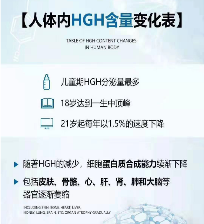 正常人体中HGH分泌量儿童期最多,在18岁达到一生中的顶峰,21岁起每年1.5%的速度下降,30岁时人体内HGH分泌量已经降到18岁的70%,60岁后已不足儿童时期的10%,随著HGH的减少细胞蛋白质合成能力续渐下降,包括皮肤、骨骼、心、肝、肾、肺和大脑的组织和器官功能续渐委缩,哀老也逐渐到来!