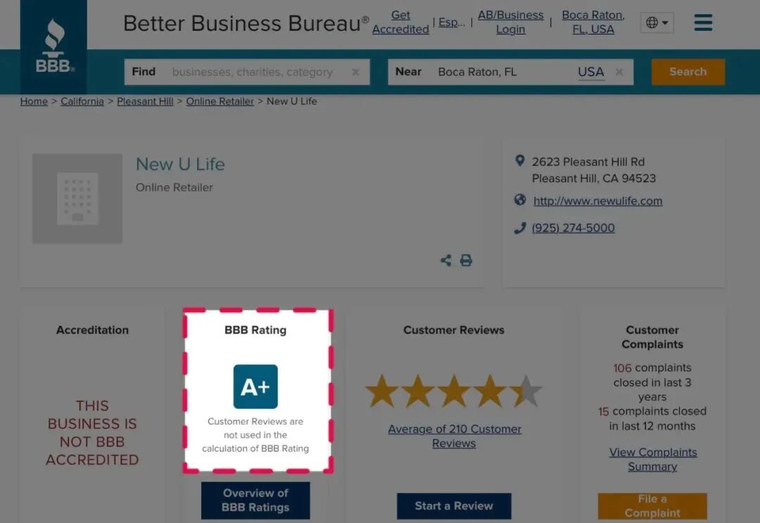 BBB平台为企业认证。BBB信托标准有八个原则:建立信任、诚实地做广告、说实话、透明、荣誉承诺、有反应、保障隐私和体现诚信。除此之外,在BBB平台认证的企业还可以享有BBB欧盟隐私盾牌服务。美国better business bureau的运行机制实际上是建立在消费者和企业共赢的基础上的,消费者可以通过BBB平台获知自己所需服务的良好企业,企业也可以通过BBB平台保护自己的隐私权利,扩展本企业在欧洲的业务版图。 BBB促使机构或企业提升自己的产品、服务质量,也促使企业机构朝着更好的方向发展。它的认证要求严格,必须在广告、消费者隐私保护及整体诚信方面的道德标准符合规范,且任何经过其认证的企业,无论规模大小,都可能因为达不到其标准而失去认证资格,故企业或机构为达到标准,也会提升自身产品、服务质量。 New U Life公司目前在BBB网站的评级为A+,是一家优等的美国公司。