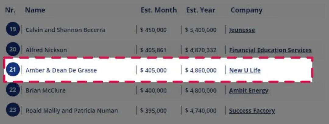 公司最高收入的钻石总裁Amber & Dean De Grasse排名第21位,年收入高达486万美元。