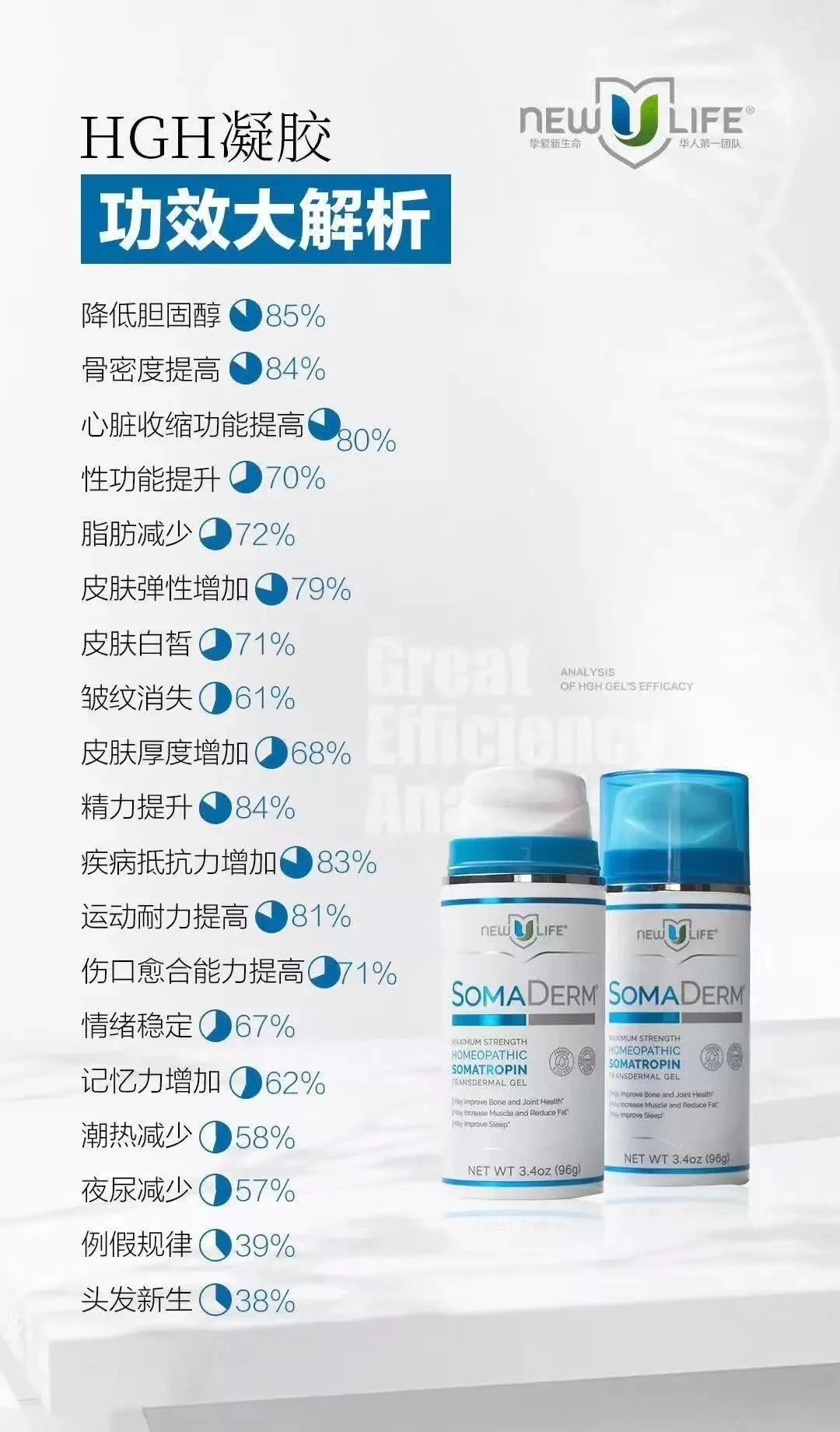 我想关于HGH给大家再科普一下。HGH从分类上来说,有两类。 【第一类】外补型的HGH。很多名人、富翁,打的一种注射型的。还有口服型的,这种是无效的。 【第二类】促进型的HGH,也可以叫HGH2。 也就是说含HGH,不管是外补型的,还是促进型的HGH2,在使用的时候,它的目的都是为了提高体内的HGH水平。因为HGH从21岁以后,就开始每年以1.5%的速度下降了。 它们的作用实际上是一样的,但是原理却是不同的。外补型的HGH是直接补充人工的HGH,受各种条件和体内环境的影响。补充进去以后提高人体内的HGH水平,然后发挥相应的作用。促进性的HGH2也就是SOMADERM凝胶,主要是提高人的自愈能力,提高人体脑下垂体自身HGH的分泌水平。通过自身HGH分泌量的增加,来提高人体HGH的水平。可能说的有点绕,我不知道家人们听清楚了没有,其实还是理解起来还是比较简单的。 为什么说注射型的虽然贵,但是还没有我们SOMADERM凝胶的效果好。因为人体本身就有一套HGH的分泌系统,就是脑下垂体。如果过多的使用了外源性的补充HGH,人体自身的HGH分泌系统的能力就减弱了。好比糖尿病的病人,经常反反复复的用胰岛素,结果最后胰腺自身的分泌胰岛素的功能就下降了,所以就产生一种依赖,甚至产生一种胰岛素抵抗。最后我们胰腺自身功能就丧失了,就得常年依靠外来的胰岛素。副作用又多,量还不好控制,效果又不好,还可能引发一系列并发症。
