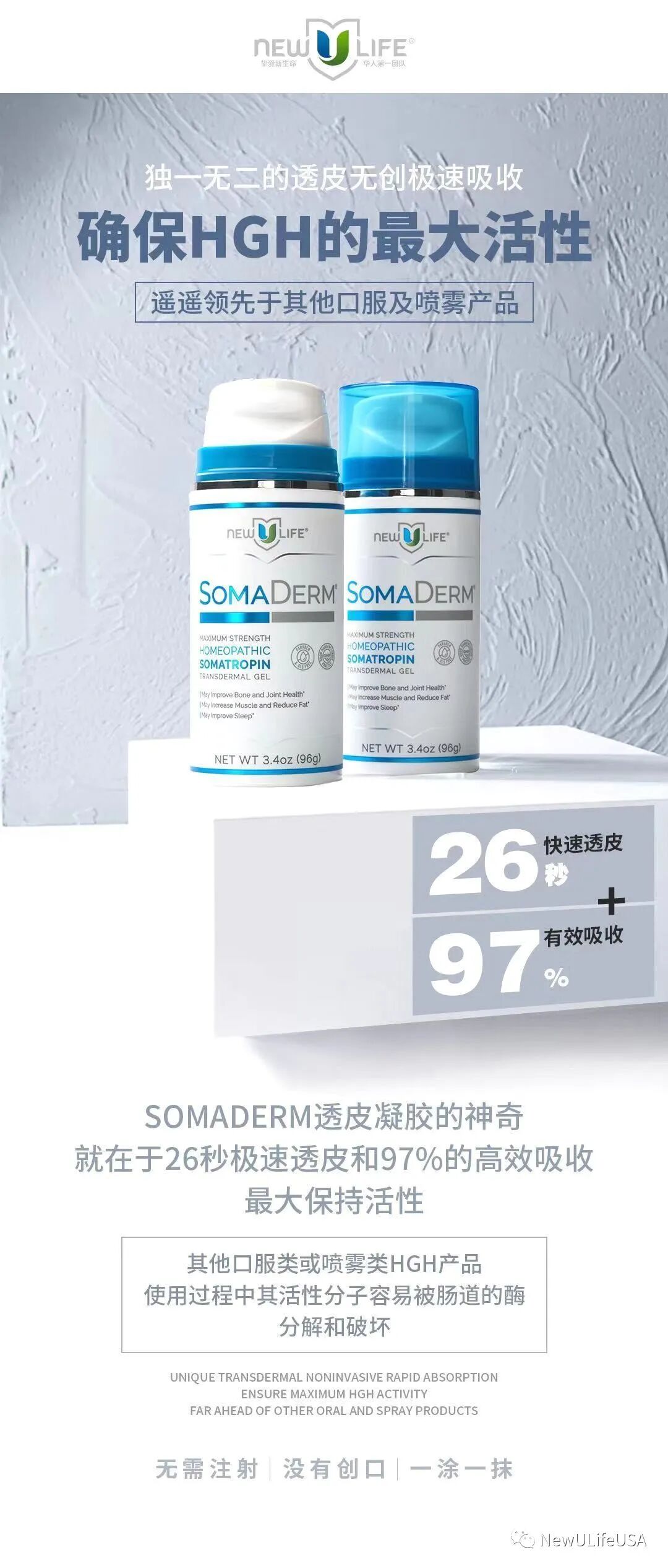SOMADERM新生命凝聚是一种基于人工重组生长激素(Somatropin) 的透皮吸收凝胶,并配有顺势疗法的肾上腺素和植物精华。
