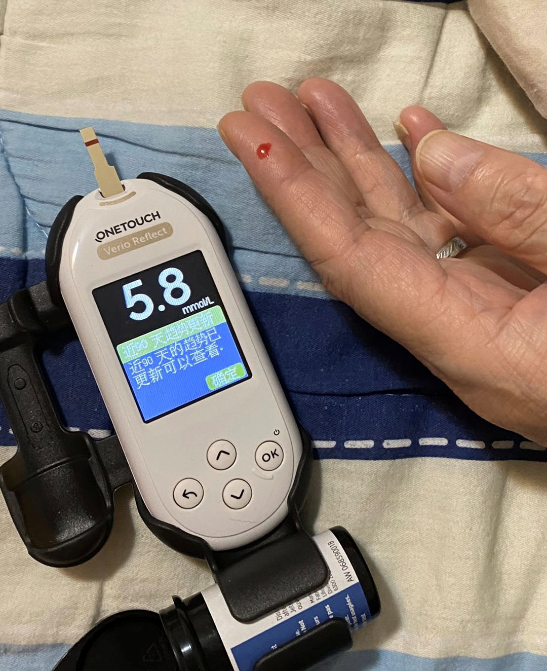 ️没想到今天4月2日,早上一起来就又测量一下血糖和血压,真让我大吃一惊,血糖又竟然降到了五点八,而血压又降到了一百三十左右(第一次量是一百二十八,第二次量是一百三十四)