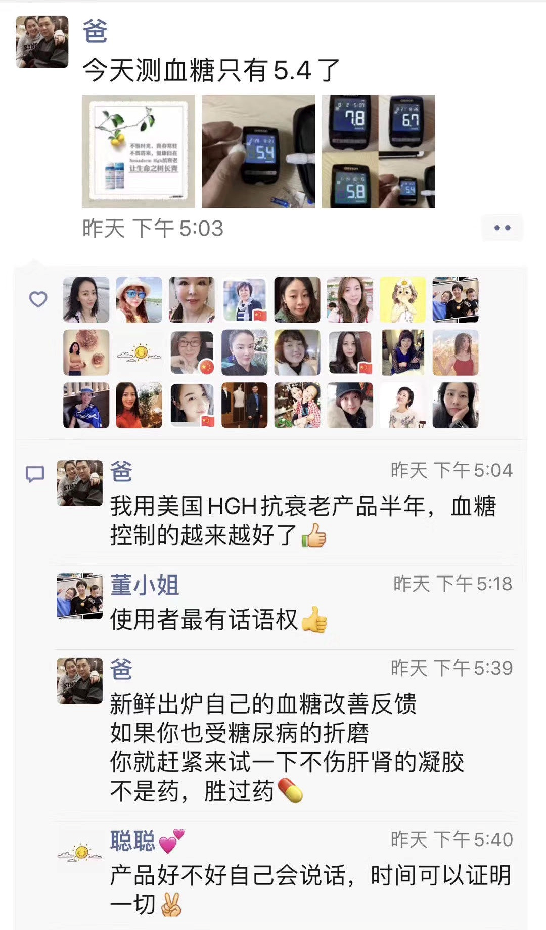 ️没命的干事业,根本不把身体当回事,过度的透支和不知疲倦的工作,结果身体血糖升到了七点二,血压升到一百五十六,这时才放慢了脚步。️这几年一直吃药控制。一次偶然的机会,去年十一月份泓贤给我用hgh抗衰老凝胶,不用口服直接涂抹手腕,二月初的测量我的血糖竟然降到了六点四,血压也降到到了一百四,最神奇的是我的满头白发开始长出很多黑发。