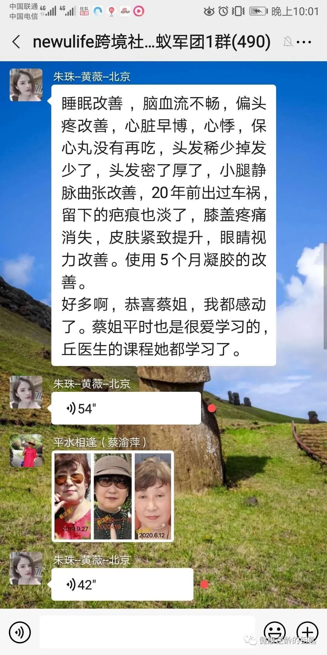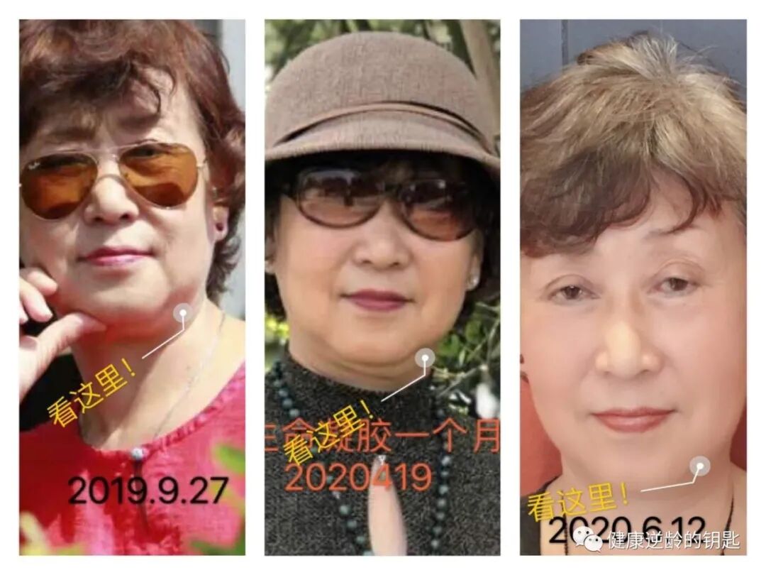 恭喜蔡姐使用5个月凝胶后的改善 睡眠改善 ,脑血流不畅,偏头疼改善,心脏早博,心悸,保心丸没有再吃,头发稀少掉发少了,头发密了厚了,小腿静脉曲张改善,20年前出过车祸,留下的疤痕也淡了,膝盖疼痛消失,皮肤紧致提升,眼睛视力改善。