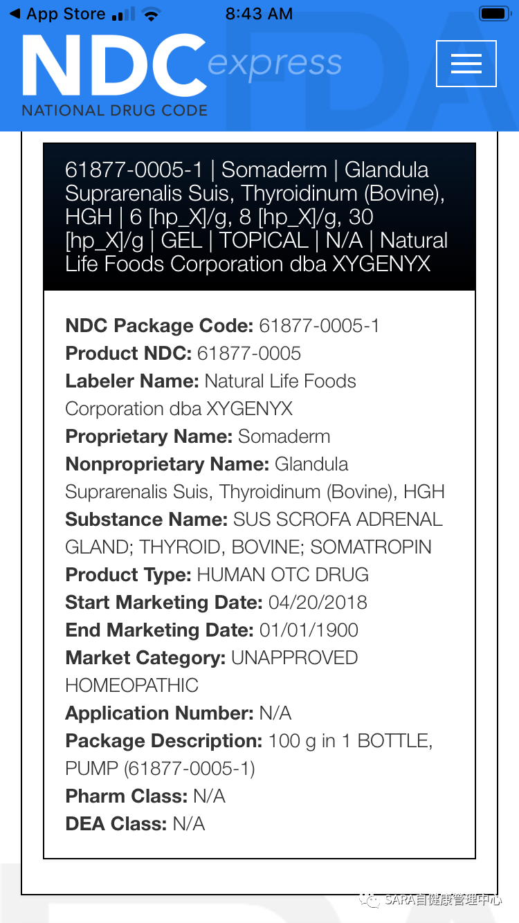 Somaderm经过7年2万人测试无一例副作用,通过FDA注册并拿到了美国国家药品代码NDC(代码编号为61877-0005-1和61877-0007-1)