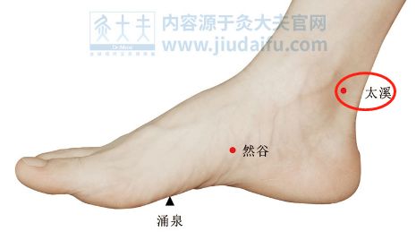 太溪在足内踝与跟腱之间的凹陷处,用力按压时,脚趾会出现麻木感。