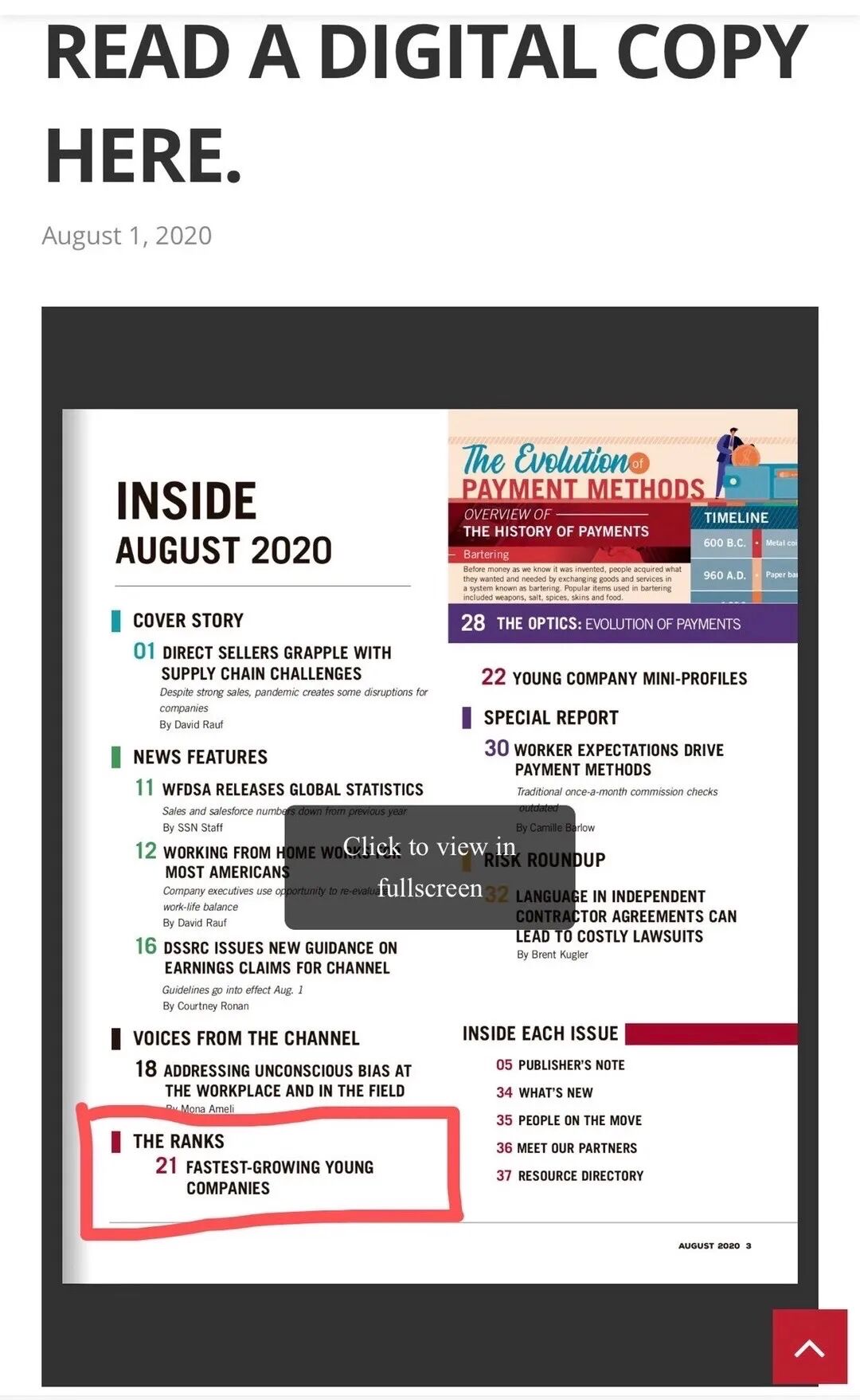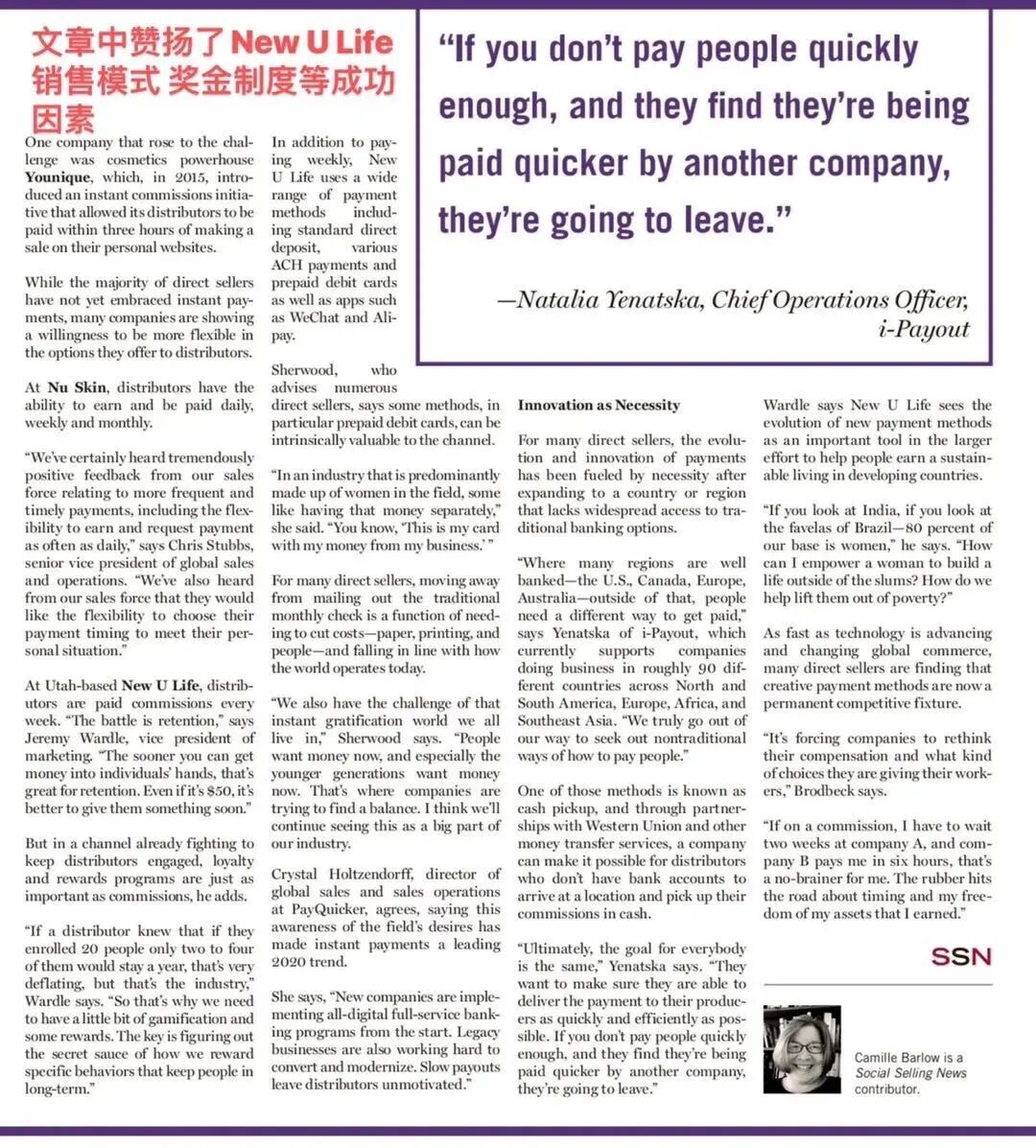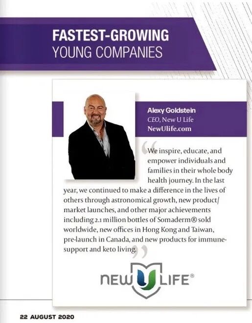 增长最快的年轻公司排名突出了对直销渠道最重要的公司、人员或趋势。2020年8月1日新发表的《社交销售杂志》中,按营收增长速度排名,New U Life公司成为增长最快的年轻直销公司。