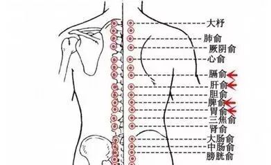 背部腧穴:膈俞、肝腧、脾腧、胃腧