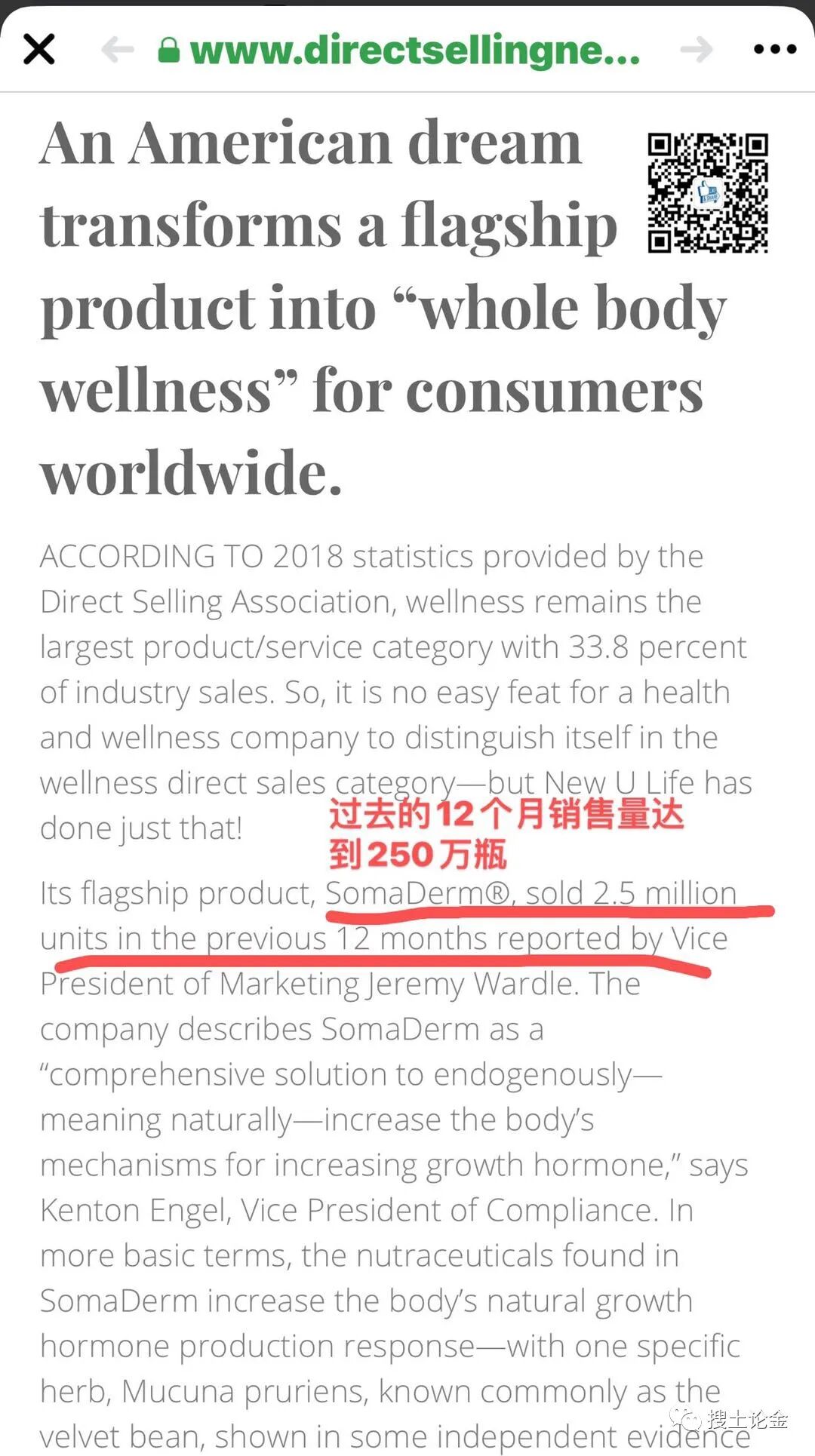 New U Life市场营销副总裁杰里米·沃德(Jeremy Wardle)报告称,旗舰产品SomaDerm®在过去12个月中售出250万瓶!