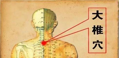 位置:大椎穴位于项部下端,第7额椎棘突下凹陷中。取穴时,将领部稍微向前倾,往项部与背部交界附近找寻,可以触摸有一凸出的最高点是第7颈椎,其下方的凹陷处就是大椎穴。