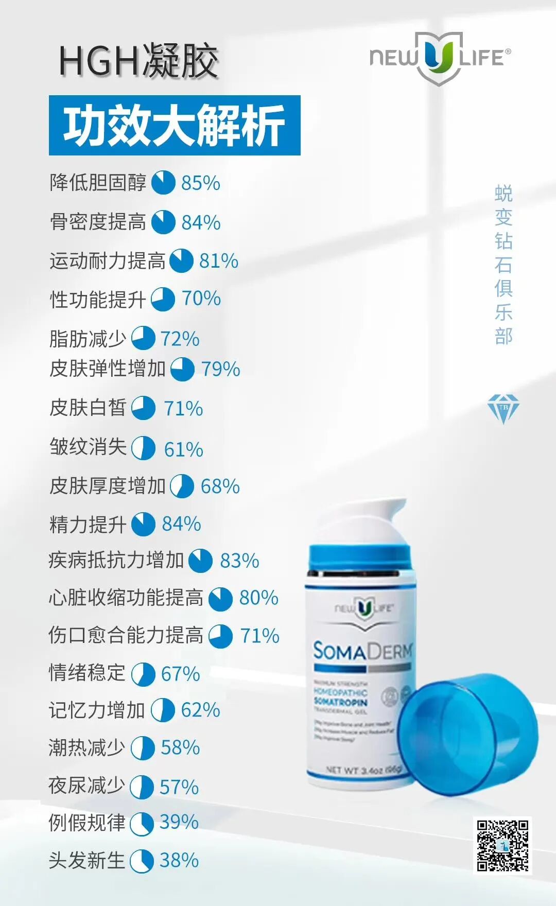 美国new u life公司经过多年研发制成的Somaderm凝胶,使用天然植物制成的生长荷尔蒙HGH跟人类自身产生的生长荷尔蒙HGH相近。