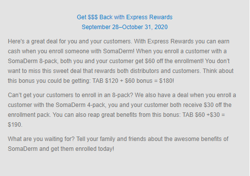 您一定不会想错过这次的促销活动,这是一个既奖励推荐人也奖励新会员的活动。所以还在等什么?赶快跟您的亲朋好友分享SomaDerm凝胶带来的好处,赶快注册吧!