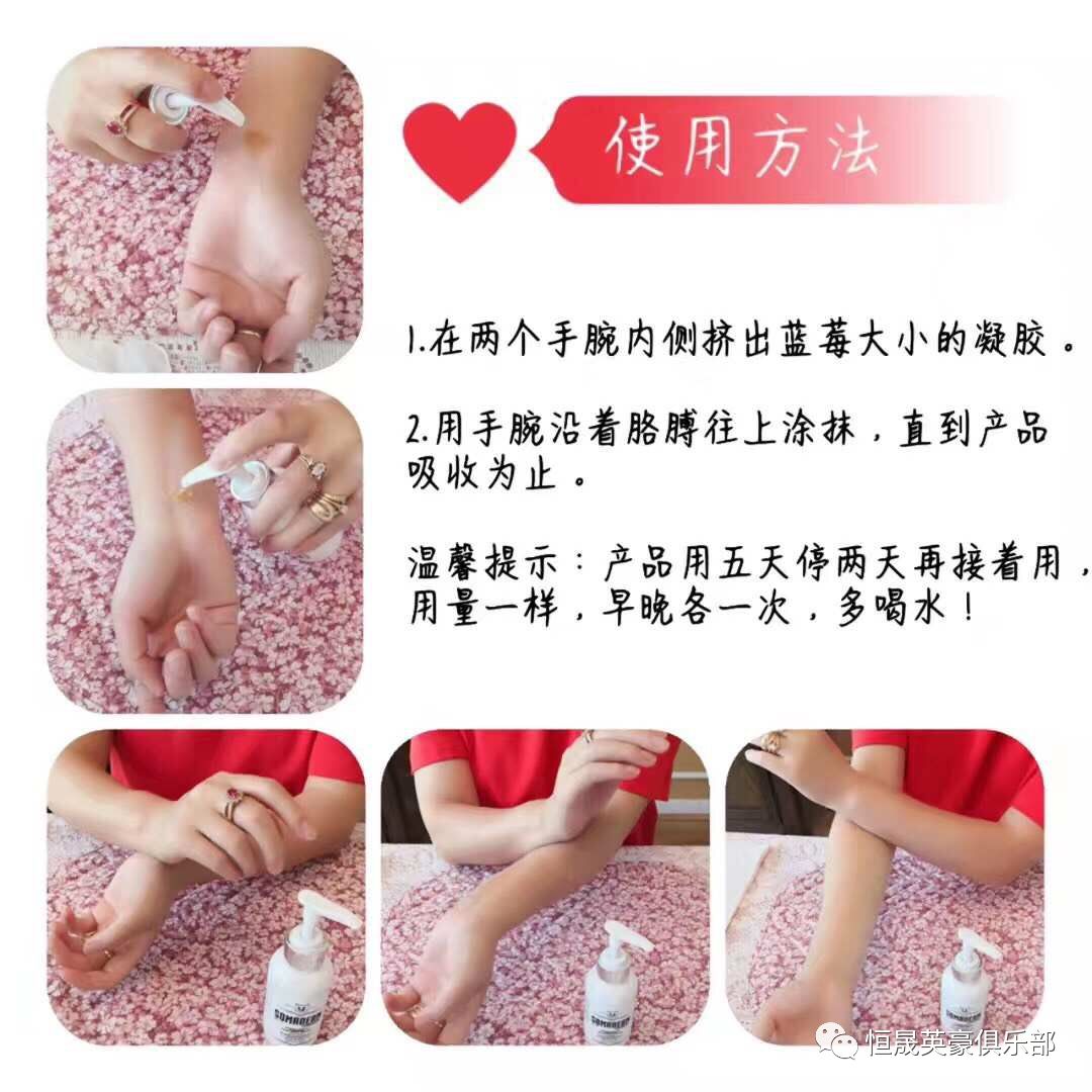 1、每天早晚2次,每次挤压出2粒蓝莓大小的凝胶,手腕擦涂。