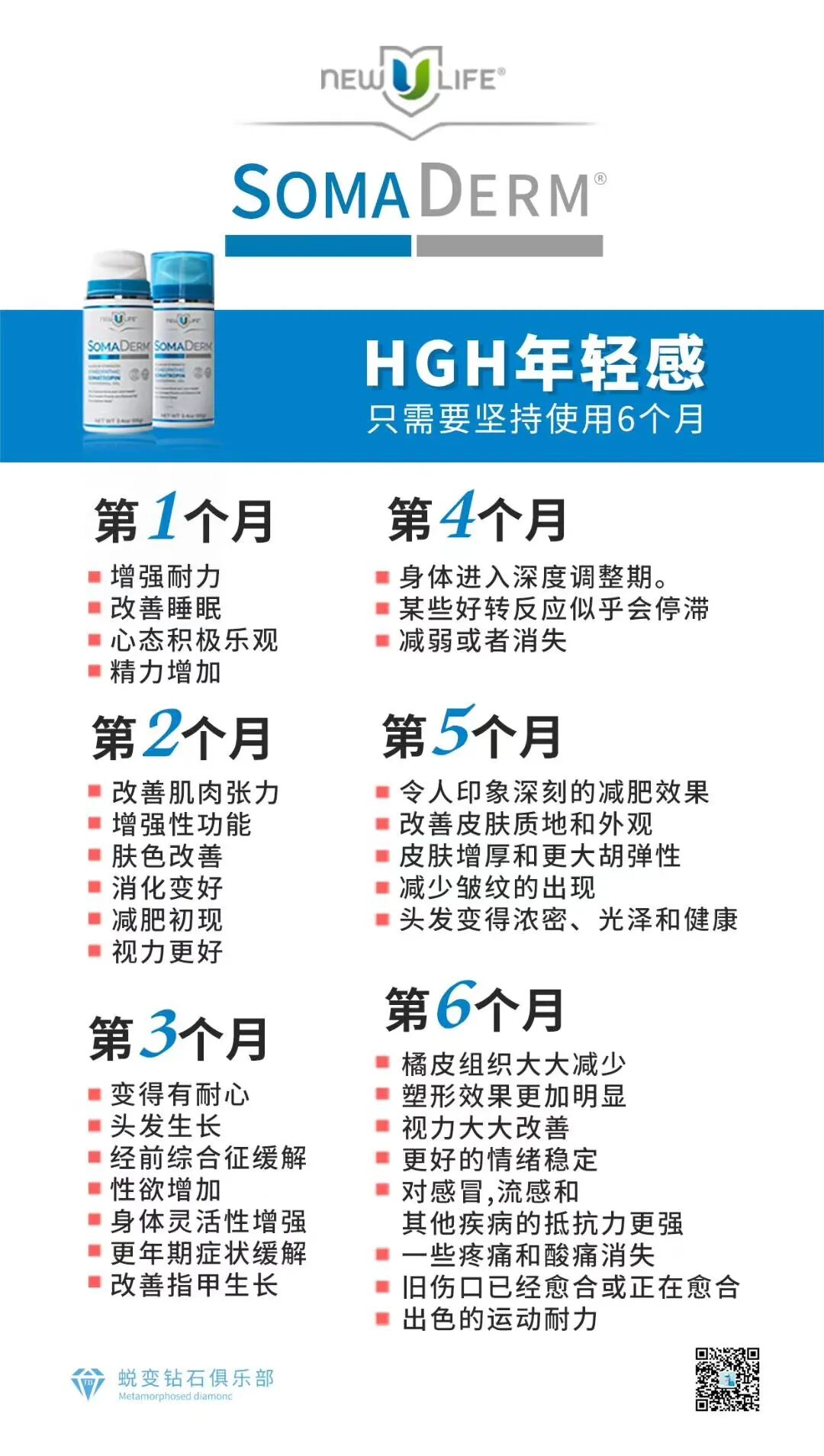 ——外在变化 1、皮肤:肌肤柔滑细腻,紧致弹润,重塑精致脸庞和透亮光彩; 2、头发:育发防脱,改善发质,让头发乌黑强韧; 3、身材:瘦身塑形,去脂增肌,增加肌肉耐力; 4、骨骼:增加骨密度,强化骨骼组织,预防骨质疏松; ——内在变化