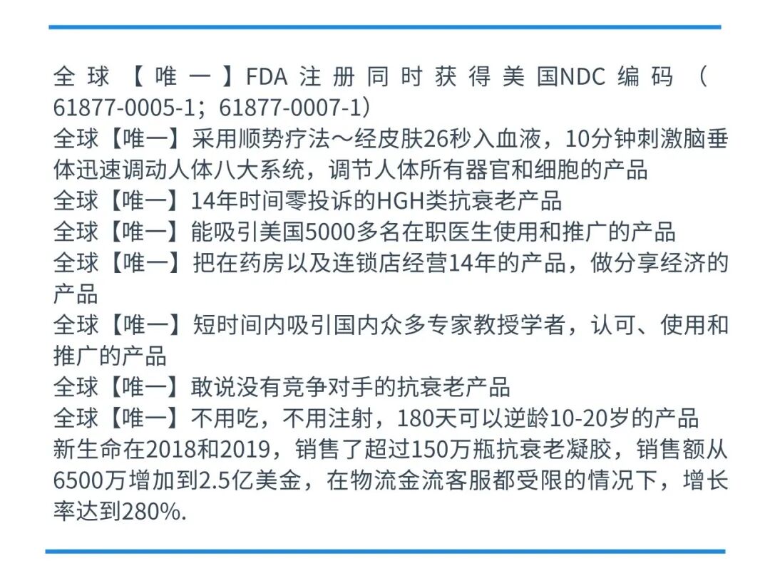 而美国新生命公司的Somaderm凝胶HGH之所以能横空出世,就是因为它具备了成为极致单品的所有属性!是当今优秀公司都不具备的引领未来抗衰老的前卫产品,拥有FDA注册号美国药品编码NDC,是备受医生推崇的非处方药品级别的保健品。