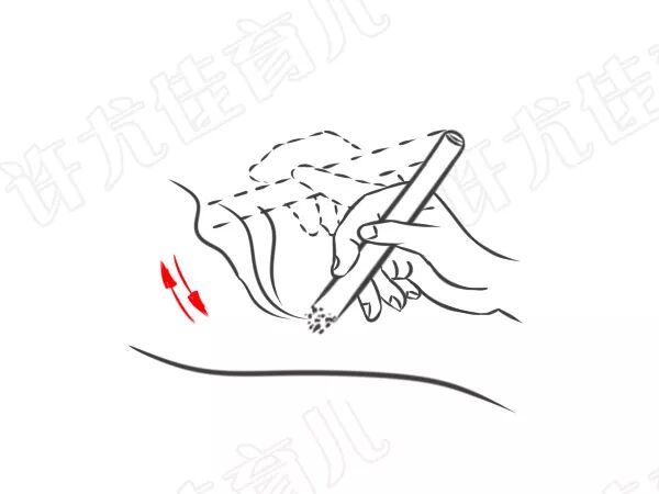 3、回旋灸:施灸时,艾条点燃的一端与施灸部位皮肤虽然保持一定距离,但艾条并不固定,而是左右移动或反复旋转施灸。
