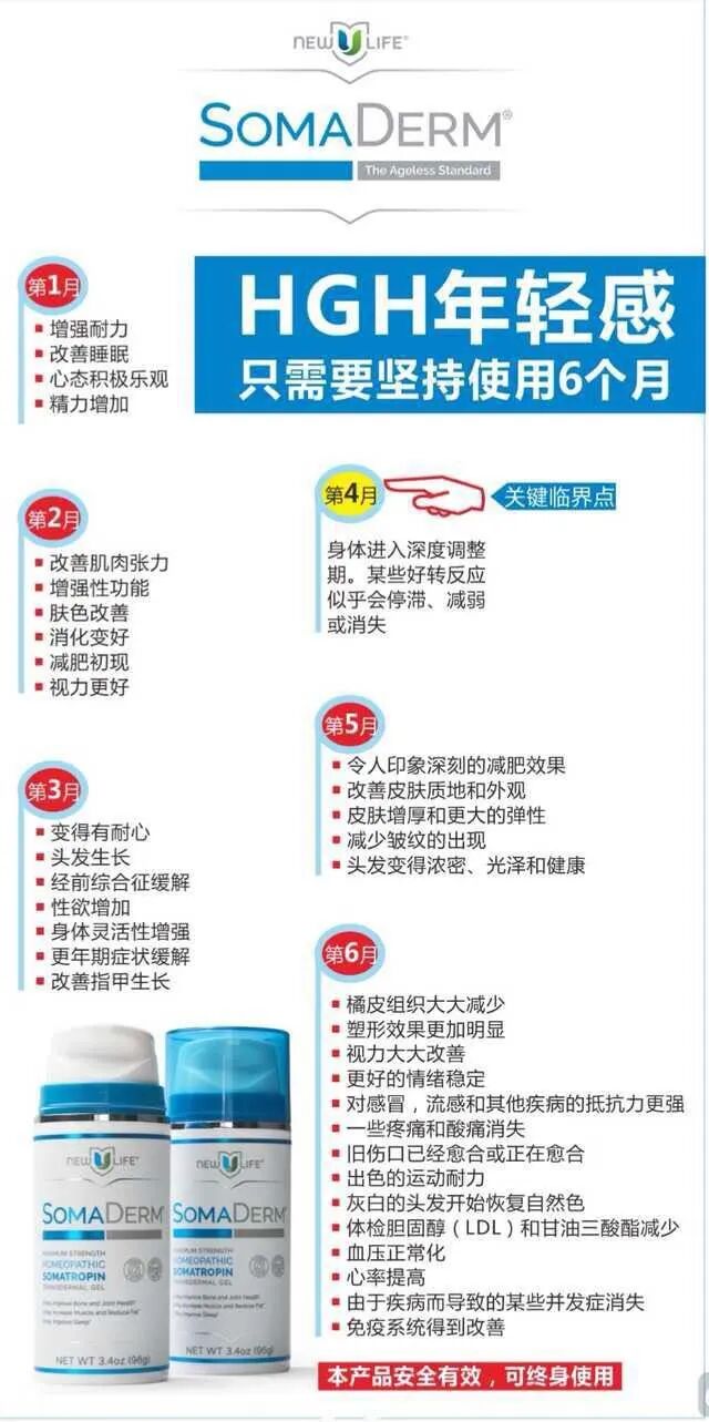 Somaderm新生命荷尔蒙,启动脑垂体前叶,从而释放出人类自己本身得到生长激素,它向脑垂体前叶发出信号,让其重新苏醒过来,释放更多的生长激素HGH,能够在我们身体各个部位发挥神奇功效!