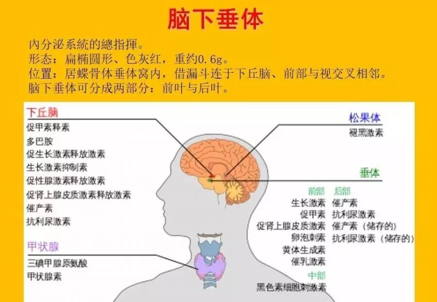 脑下垂体是内分泌系统的总指挥,位于大脑的基底部,通过漏斗状的脑组织连于下视丘的脑区正下方。其中最重要的荷尔蒙是生长激素,分泌出来后进入血液为肝脏所吸收,在肝脏细胞转变成不同的生长激素来进行作用,其中以IGF-l最重要。身体内每一个器官的发育生长,都需要各种形式的生长激素。