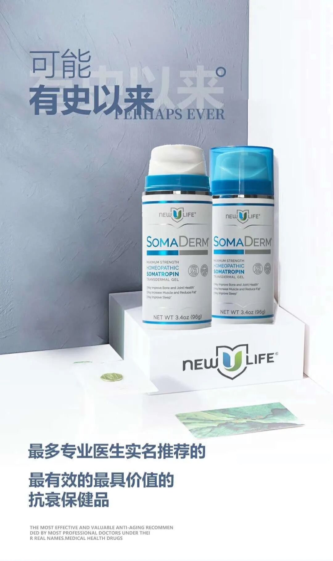 美国New U Life新生命公司推出的SOMADERM抗衰老凝胶,采用顺势疗法,经美国FDA注册,仅需每天两次涂抹,26秒透皮吸收,调理平衡人体八大系统,是目前抗衰领域里独一无二的黑科技产品。