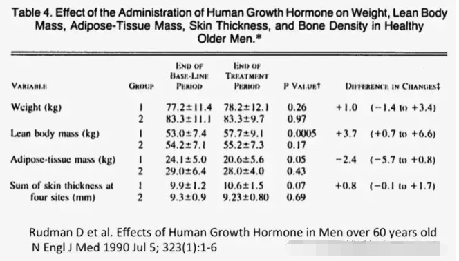 生长激素组增加了3.7公斤(8.8%)的瘦体重,脂肪下降了2.4kg(14.2%),皮肤的紧实度也增加了。